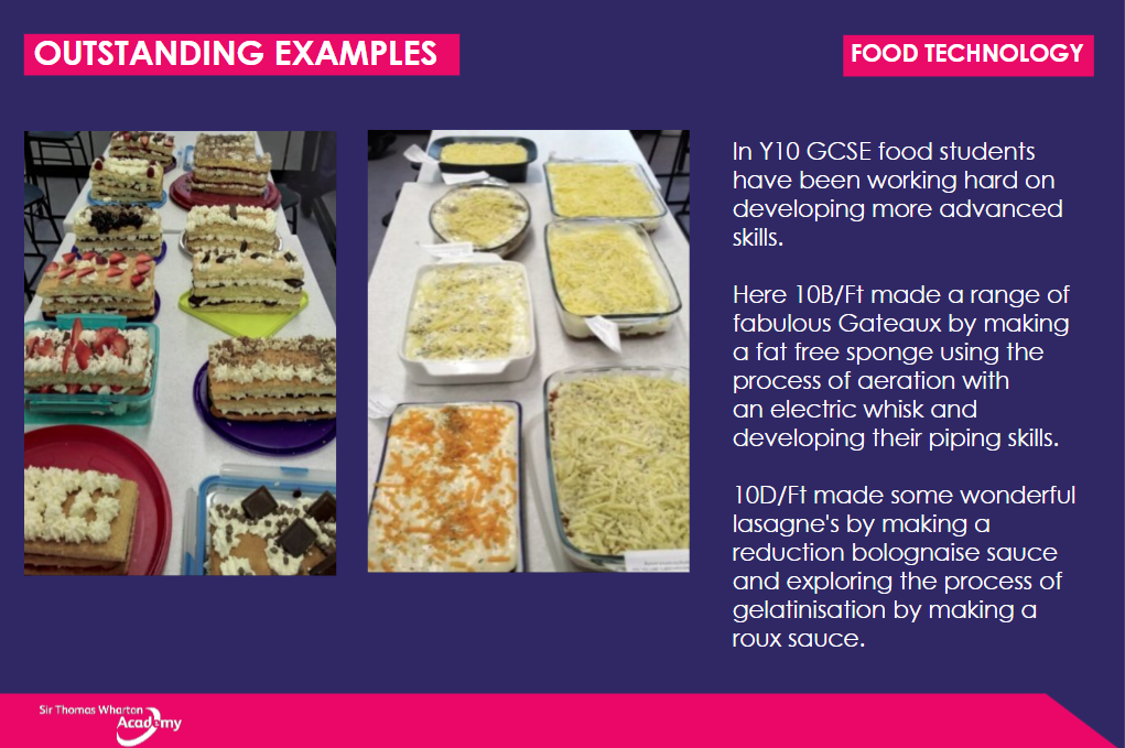 As students move through their journey at Sir Thomas Wharton, they will learn new skills, but also repeat and refine existing ones to become fully able and confident in the workroom or kitchen. Our examination courses are designed to develop a student’s independence, develop effective research methods, work to deadlines and gain a real grounding in the theory of food science and nutrition as well as design and technology.