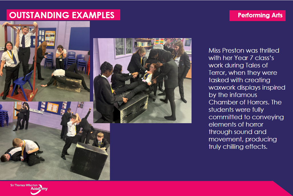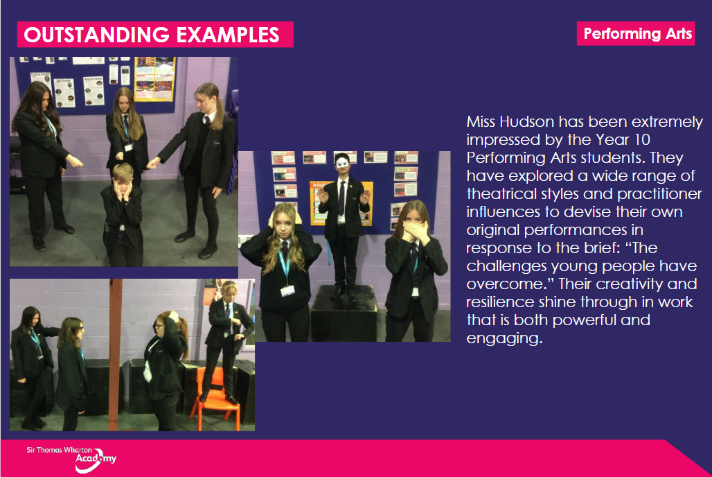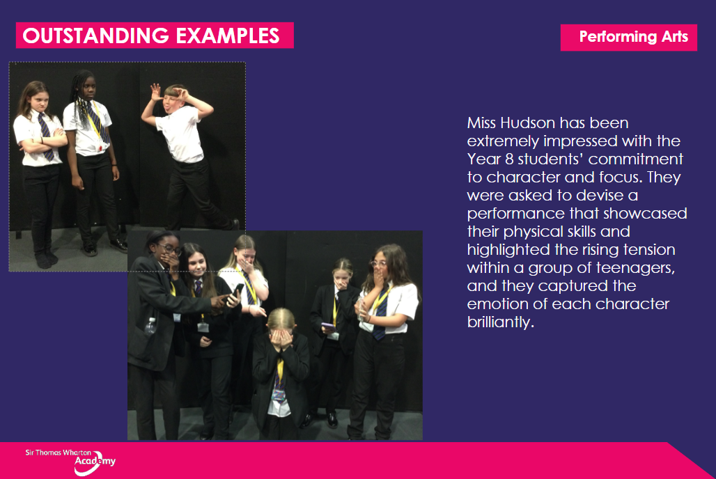 The structure of the curriculum is based on a spiral progression of learning. Through the recursive nature of the subject, pupils will re-visit the skills and techniques via different genres, texts and styles of performance, constantly building upon and developing their knowledge and understanding of performance. They will regularly explore how to creatively demonstrate; voice, physicality and audience awareness to present a role. The practice of critical self and peer reflection is embedded through the learning experience.