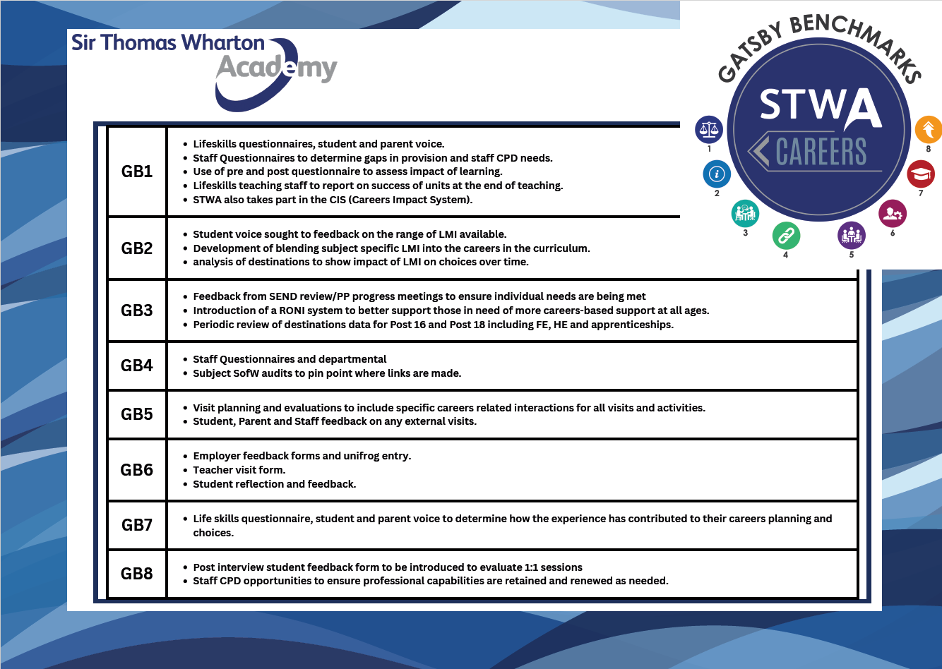 The table below shows how Sir Thomas Wharton Academy measures and assesses the impact of the careers programme on students through each Gatsby Benchmark.